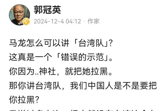 点击输入图片刻画(最多30字)然而,马龙在此次的走访中国台湾时因为一句话而给我方惹了贫寒。原本,马龙在插足一次看成时,说出了台湾队这三个字。恰是因为这三个字,引起了部分东说念主的发火。其中一位名叫郭冠英的作者,更是在外交媒体上发出了长文,对马龙进行怒批。